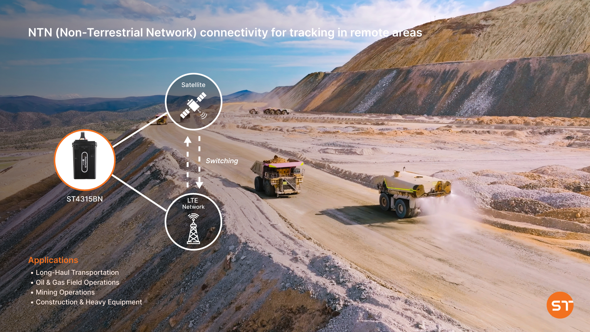 The ST4315BN is a hybrid LTE + NTN (satellite) GPS tracking device designed to maintain continuous fleet and equipment visibility by automatically switching to satellite connectivity when LTE coverage becomes unavailable.